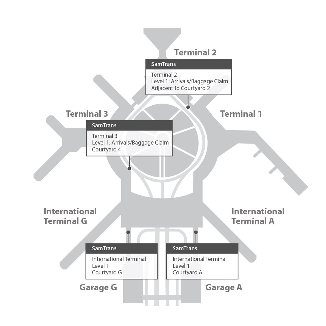 SamTrans Route 292 stops directly at the Airport terminals. Route EPX and 142 stop at the Rental Car Center and can be reached from the terminals by using the AirTrain blue line. Routes 292 also stop along North McDonnell Road and operate during the day and the evening.